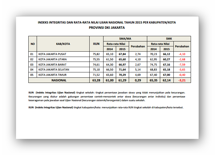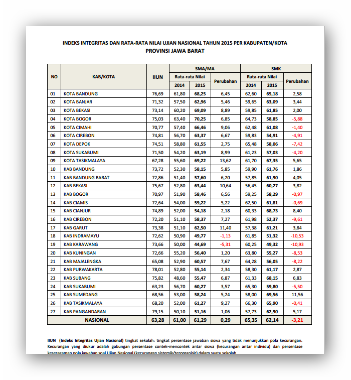 Kemendikbud sudah merilis daftar Indeks Integritas dan Rata2 UN tahun 2015 per kabupaten/kota se Indonesia. Filenya dapat diunduh di bawah ini.